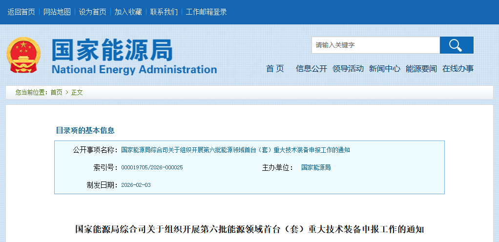 2月9日,国家能源局综合司发布《关于组织开展第六批能源领域首台(套)重大技术装备申报工作的通知》(以下简称《通知》),组织开展第六批能源领域首台(套)重大技术装备申报工作。