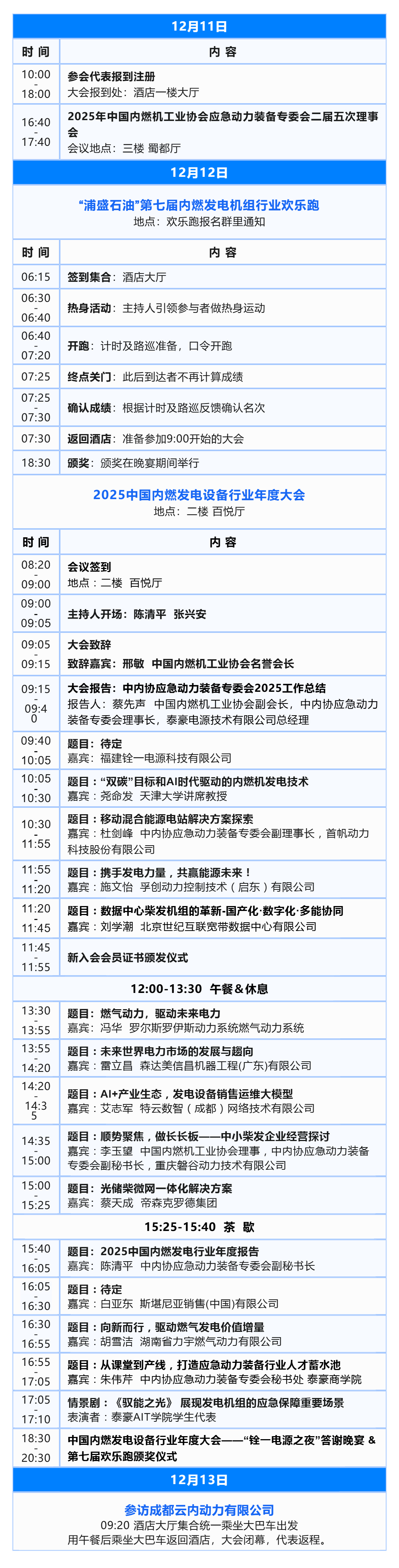 “新程共赴 电定乾坤”,由中国内燃机工业协会指导,中国内燃机工业协会应急动力装备专委会、GPOWER动力展主办的“2025中国内燃发电设备行业年度大会”“中国内燃机工业协会应急动力装备专委会二届五次理事会及会员代表大会”拟于2025年12月11-13日在四川成都召开。